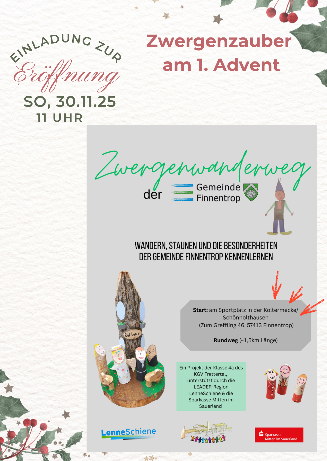 Unsere Musikschule ist mit einer Station auf dem Zwergenwanderweg der Gemeinde Finnentrop vertreten! Schülerinnen und Schüler der Klasse 4a des KGV Frettertal haben ihn gestaltet. Die feierliche Eröffnung findet am Sonntag, 30. November um 11 Uhr am Sportplatz in der Koltermecke (Schönholthausen) statt. Weitere Infos im Flyer