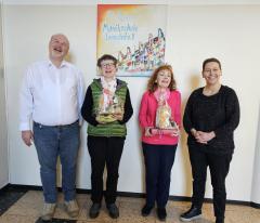 Nach über 20 Jahren erfolgreicher Tätigkeit hat uns unsere Kollegin im Fachbereich Flöte, Querflöte Klavier, JeKits 1 und Jekits 2-4 Irmhild Haastert (2. v. links) verlassen, weil sie im Düsseldorfer Raum einen neuen Lebens - und Arbeitsmittelpunkt gefunden hat. Anlass genug Irmhild nach ihrem Abschiedskonzert im Dezember auch ganz offiziell mit gleich zwei weinenden Augen und den besten Wünschen für ihre berufliche Zukunft zu verabschieden. Ein besonders seltenes Jubiläum durfte unsere Klavier - und Gesangslehrerin Carmen Verley (3. v. links) begehen. Sie feierte ihr 40-jähriges Dienstjubiläum und erhielt eine durch unseren Vorstandsvorsitzenden Dietmar Rottmann (1.v. links) eine besondere Anerkennung die lange geleistete instrumentalpädagogische Arbeit.